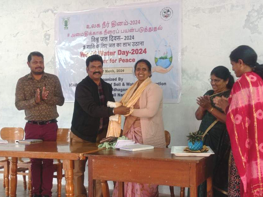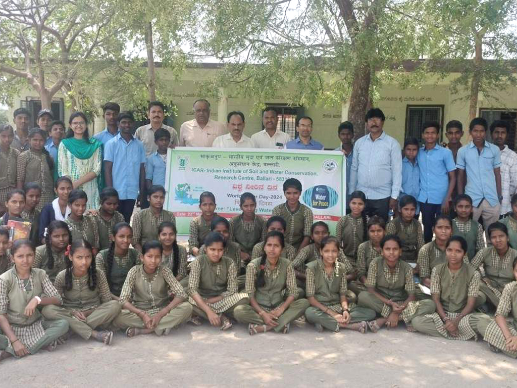 ICAR-Indian Institute of Soil and Water Conservation, Research Centre, Ballari Celebrated World Water Day at Government Higher School, Sridharagadda village on 22nd March, 2024. The programme was chaired by Dr. B.Krishna Rao, Head of Centre in the presence of Chief guest Shri. Gunda Acharya, Principle of the School and Sh. Manjunatha, village leader. The programme was coordinated by Dr. Ravi Dupdal, Sr. Scientist (Agril. Econ.) & Ms. Anusha, N.M. Scientist, (Fruit Sci.). The programme was actively participated by all the school children. During the programme, Essay competition on the topic “Importance of water” was organized among the school children. Later, all the guests addressed the school children about the importance of water and created awareness among young minds. Dr. B. S Naik, Principal Scientist (SWCE), educated the participants about water availability, its present usage and significance of water for human life. Dr. B.Krishna Rao addressed the students regarding the importance of World Water Day and its history behind celebration and told that it is celebrated to create awareness among public for conservation and judicious use of water. Further, Dr. Rao also sensitized the students for efficient management of water both in terms of quality as well as quantity in order to preserve the water for the future generaton. During the event, prizes were distributed to students who secured 1st, IInd and IIIrd position in essay competition, and Pledge for World Water Day was also administered by all the participants for conserving and judicious use of precious water. At the end, formal vote of thanks was proposed by Dr. Ravi Dupdal, Sr. Scientist (Agril. Econ.). The programme was assisted by Sh. Abhishek Kumar, Technician. A total of 80 members participated in the programme including office staff.