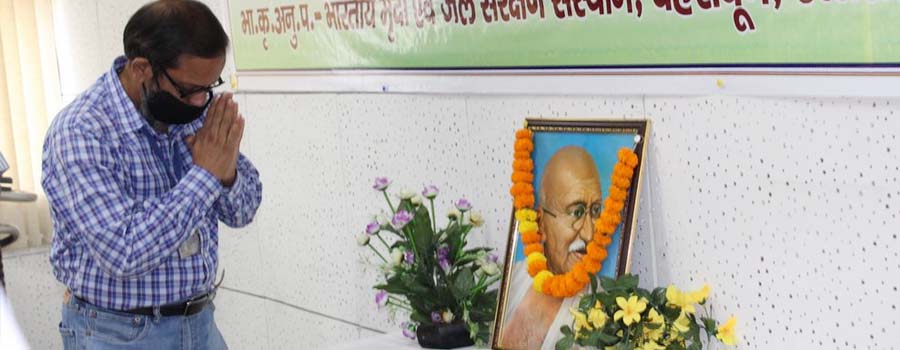 ICAR-Indian Institute of Soil & Water Conservation (IISWC), Dehradun celebrated 150th birth anniversary of Mahatma Gandhi Ji on 2nd October 2020. The programme was started with ICAR song and showering flowers to the photo of Gandhi Ji. On this occasion, Director of the Institute, Dr R S Yadav addressed and insisted all to take inspiration from the life of Mahatma Gandhi Ji. He said that people should be loyal and responsible to their works. There is an urgent need to follow the path shown by our father of nation. The programme was graced by the presence of all the Heads of the Divisions, Dr N K Sharma, Dr P R Ojasvi, Dr Harsh Mehta and Dr Bankey Bihari.