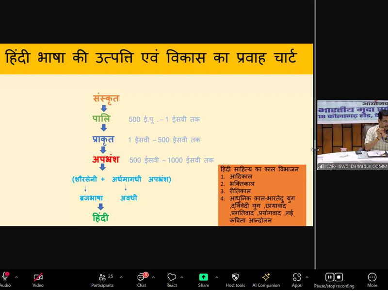 Hindi Debate Competition (through Zoom Meeting) was organized at Indian Institute of Soil and Water, Dehradun on 06.09.24 from 3:00 pm to 5:45 pm. The topic of discussion in this competition was - “Separating Hindi dialects from Hindi and recognizing them as independent languages is a danger signal for the Hindi language” (with special reference to the Eighth Schedule of the Indian Constitution and the National Education Policy 2020).