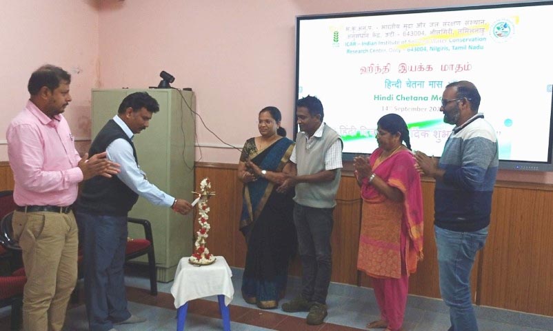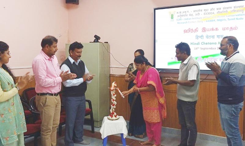 भाकृअनुप-भारतीय मृदा एवं जल संरक्षण संस्थान, अनुसंधान केंद्र, उधगमंडलम ने 14-09-2023 को हिंदी दिवस मनाया और हिंदी चेतना मास का उद्घाटन किया। कार्यक्रम की शुरुआत मंगलाचरण गीत और वरिष्ठ वैज्ञानिक और हिंदी अधिकारी डॉ. एस एम वनिता के स्वागत भाषण और उसके बाद दीप प्रज्ज्वलन से हुई। हिंदी चेतना मास के दौरान आयोजित कार्यक्रम और गतिविधियों के बारे में जानकारी हिंदी अधिकारी डॉ. एस एम वनिता द्वारा दी गई और केंद्र के कर्मचारियों द्वारा कामकाजी ज्ञान और आधिकारिक हिंदी भाषा के उपयोग में सुधार के लिए सुझाव दिए गए।