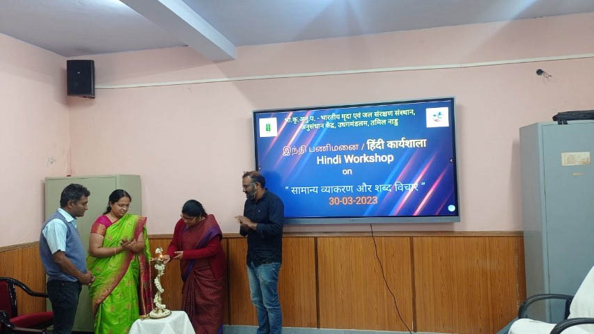 भाकृअनुप-भारतीय मृदा एवं जल संरक्षण संस्थान, अनुसंधान केंद्र, उधगमंडलम द्वारा "सामान्य व्याकरण और शब्द विचार" पर त्रैमासिक हिंदी कार्यशाला का दिनांक मार्च 30, 2023 को आयोजन किया गया। कार्यक्रम की शुरुआत श्री जॉर्ज जॉन, टी-6 के स्वागत भाषण से हुई। इसके बाद मंगलाचरण गीत और दीप प्रज्ज्वलित किया गया। डॉ. पी. सुंदरमबल, प्रधान वैज्ञानिक एवं कार्यवाहक केंद्राध्यक्ष ने कार्यक्रम का उद्घाटन किया और हिंदी को एक आधिकारिक भाषा के रूप में बढ़ावा देने और उपयोग करने के लिए केंद्र में की गई विभिन्न गतिविधियों के बारे में जानकारी दी । डॉ. एस.एम. वनिता, वरिष्ठ वैज्ञानिक एवं हिंदी अधिकारी, ने हिंदी में आमतौर पर इस्तेमाल होने वाले विभिन्न आधिकारिक शब्दों और वाक्यों के बारे में बताया। हिंदी में अपना नाम लिखने और हिंदी में संख्या सीखने का अभ्यास करने के लिए सभी कर्मचारियों के साथ एक गतिविधि भी आयोजित की।केंद्र के सभी वैज्ञानिक, तकनीकी, प्रशासनिक और अन्य कर्मचारियों ने कार्यक्रम में सक्रिय रूप से भाग लिया और आधिकारिक नियमित कार्यों में हिंदी शब्दों का प्रयोग सीखा। औपचारिक धन्यवाद ज्ञापन के साथ कार्यक्रम समाप्त हुआ।