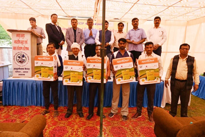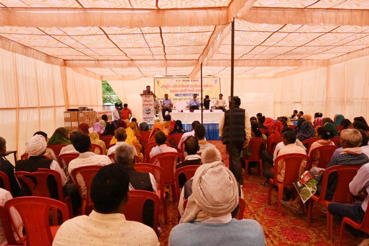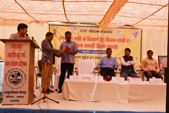 ICAR-Indian Institute of soil and water conservation, Research Centre, Agra organized a Kisan gosthi cum input distribution program under SCSP scheme on February 24, 2023. The main purpose of the program was to create awareness among the farmers about SCSP activities and distribution of the already purchased items to the selected farmers under the SCSP scheme. The program was started with the welcome address by Dr. K. K. Sharma, Pr. Scientist & Head, ICAR-IISWC, Research Centre Agra. The program was chaired by Prof. N. K. Sharma, Dean, Baba Saheb Dr. Bhim Rao Ambedkar College of Agricultural Engineering & Technology, Etawah, as a Chief Guest. The special lectures were delivered by the invited speakers Dr. Manish Singh, Head KVK, Awagarh, Dr. Rajendra Singh, Head KVK, Bichpuri, Agra, and Sh. P.K. Mishra, Deputy Director Agriculture, Agra (U.P.). More than 150 farmers from selected SCSP villages of Andaunka pura and Mudhera, district Agra, participated in the program. During this program, 20 sewing machines, 20 power sprayers, 50 seed storage bins, and 100 framing tool kits were distributed to the selected scheduled cast farmers. The program ended with the chief guest's address as well as concluding remarks by prof. N.K. Shrama and a formal vote of thanks by Dr. R.K. Dubey, Pr. Scientist. The program was coordinated by Dr. R. B. Meena, Sr. Scientist & organizing chairman of the event.
