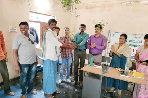 He explained the main objectives of the programme and sensitized the farmers about World Environment Day. Dr. M.N. Ramesha, Scientist (Forestry) explained brief history and importance of celebration of programme and also explained consequences of use of plastics in daily life. Dr. B.S Naik P.Sci (SWC Engg.) explained about importance of environment and its protection for future generation. Dr. M.Prabhavathi, Sr. Sci (Soils) & Head of the Centre explained about soil health management and its testing for increasing crop yields and also maintaining soil fertility. As a part of programme, farmers and school childrens were distributed horticulture plant (lime) for plantation. At the end, Dr. Ravi Dupdal proposed formal vote of thanks. The programme was assisted by Mr. Mohan Kumar, Technical Officer, Mr. Abhishek Kumar, T-1 and Mr. Ravichandra, TO (VD). The program was participated by 46 including farmers, school childrens and staff members.