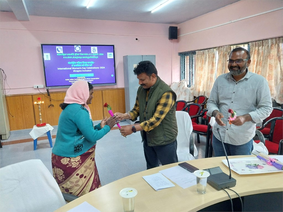 ICAR-Indian Institute of Soil and Water Conservation, Research Centre, Udhagamandalam organized International Women’s Day with the theme #InspireInclusion. The program was organized to raise awareness about gender equality (social, economic and political), women's rights, reproductive rights, gender violence, and abuses against women. During the first part of the program, Mrs. Blessy V.A welcomed all the staffs of centre and highlighted the significance of celebrating the International Women’s Day. As a part of the celebration, all the women staff of centre was felicitated and has motivated by the Dr Somasundaram Jayaraman, Head of the Centre and highlighted the importance of women’s role in society upliftment and need to respect and promote women in all spheres. Following to this few staffs shared their experiences related to women empowerment. The programme ended with an insight “To keep a safe environment for every woman in the workplace”. All staffs of the centre participated in the programme. The program was coordinated by Mrs. Blessy V.A., and Dr Somasundaram Jayaraman.