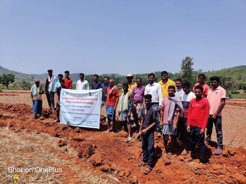 Trench-cum-bund technology for in-situ soil and water conservation was demonstrated and its benefits were explained to the farmers of the Umuri village of the Koraput block on 23.03.2024 under the DST-funded project entitled “STI-Hub Up-scaling sustainable technological solutions and replicable models for ensuring food and nutrition, livelihood and social security of Scheduled Tribes in selected Gram Panchayats of Koraput district, Odisha”. Trench-cum-bund work was carried out in 17 nos. of farmers field of Umuri and Pondi village covering an area of 15.4 ha. The technology has a potential to reduce runoff, harvest soil moisture, control soil erosion, which in turn will increase the productivity of the crops grown there. During the event, Dr. D. Ramajayam, Head, ICAR-IISWC, RC, Koraput, Dr. Saubhagya Kumar Samal, Dr. Saswat Kumar Kar, Scientists and Dr. Kartik Lenka, Scientist, MSSRF, Jeypore were present and interacted with beneficiary farmers regarding the technology.