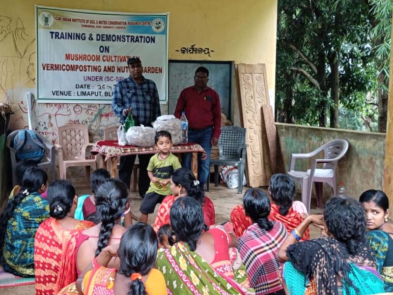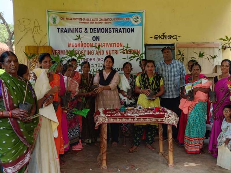 ICAR- Indian Institute of Soil and water Conservation, Research Centre, koraput organized 3 days training programme on Training and demonstration On Mushroom Cultivation, Vermicomposting and Nutri-Garden at Vill-Limaput GP- Block- Lamtaput Dist- Koraput, Odisha under SCSPduring 26-28 September 2024. On 26 September 2024 Sh. G.W.Barla, STO briefed in details about technical aspects and importance of mushroom cultivation ,practically demonstrated process of mushroom growing and urged the SHG members to adopt the technology for income augmentation. A total of 25 SHG members of Vill-Limaput GP- Block- Lamtaput Dist- Koraput, Odisha were trained. On 27 September 2024 Dr S.K.Samal, Sci(Soil) summarized importance of vermicompost as nutiri supplement in crops thereby ensuring a good harvest, reducing dependency on chemical fertilizer so as to reducing the cost of cultivation and also practically demonstrated the preparation process of vermicomposting. A total of 25 women SHG group members from Vill- Dhadi GP- Dabuguda Block- Lamtaput Dist- Koraput, Odisha were trained in this training programme. On 28 September 2024 Dr J. Lenka, Sci (fruit Science) outlined different Nutri-Garden models , establishment procedures and packages and practices involved. A total of 25 women SHG group members from Vill- Silpada GP- Dabuguda Block- Lamtaput Dist- Koraput, Odisha were trained in this training programme. The training prgramme is coordinated by Sh G.B.Naik, ACTO and Sh. S.Kindal,TO.