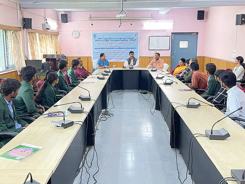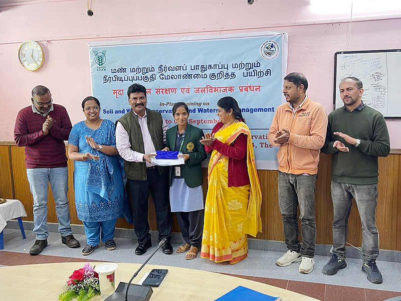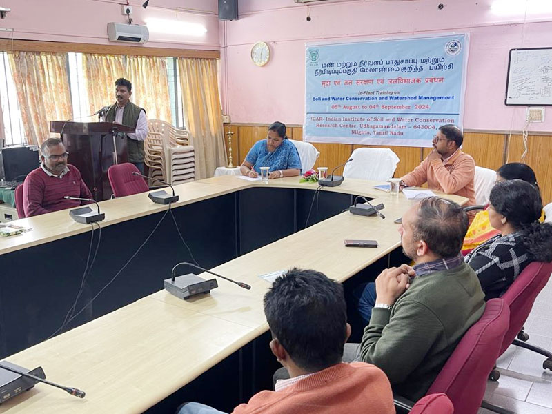 ICAR-Indian Institute of Soil and Water Conservation (IISWC), Research Centre, Ooty organized valedictory programme of one month training on “Soil & Water Conservation and Watershed Management” on 04.09.2024. Total 10 nos (8 boys & 2 girls) B.Tech students from College of Agricultural Engineering, Bapatla, Andhra Pradesh (8 nos.) and Bannari Amman Institute of Technology, Sathyamangalam, Erode, Tamil Nadu (2 nos.) successfully completed one month in plant training from 05-08-2024 to 04-09-2024. One month In-plant training covered various topics such as SWC technologies, runoff & soil erosion, erosion control measures, INM, agroforestry, micro-irrigation, GIS & RS, impact assessment, climate change & its impact on NRM, watershed development, use of AI & drones in agriculture and many such theory & practical classes in the course. Dr. Somasundaram Jayaraman, Course Director & Head of the Centre addressed the students and briefed about the importance of soil erosion control and soil health improvement, need for creating awareness among farmers for adoption of SWC technologies and soil erosion control and also discussed different career opportunities in the field of soil and water conservation. The students got completion certificates and best performer in the one-month training programme. All the scientific, technical and project staff participated in the programme. The training programme was coordinated by Dr HC Hombegowda, Senior scientist and Dr SM Vanitha, Course coordinator & Senior scientist under the guidance and leadership of Dr. Somasundaram Jayaraman, Head & Course Director, ICAR-IISWC, Research Centre, Udhagamandalam.